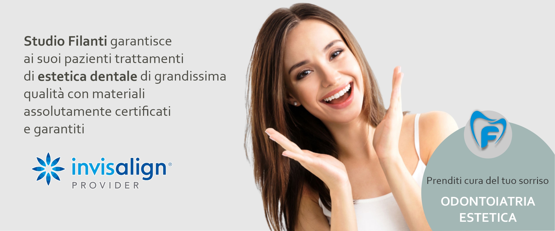 L’estetica dentale è quella branca dell’odontoiatria che cura i problemi legati alla bellezza dei denti e del cavo orale. Si pone come obiettivo assoluto quello di regalare al paziente un sorriso perfetto. Il sorriso è il nostro primo biglietto da visita e per questo è così importante che venga valorizzato come merita. Nello Studio Filanti è stata sempre dedicata la massima attenzione all’estetica dentale così da restituire un sorriso perfetto e naturale a chi l’aveva perso. L’obiettivo di ogni intervento di odontoiatria estetica è infatti il raggiungimento di risultati di altissimo livello, per la massima soddisfazione dei pazienti.