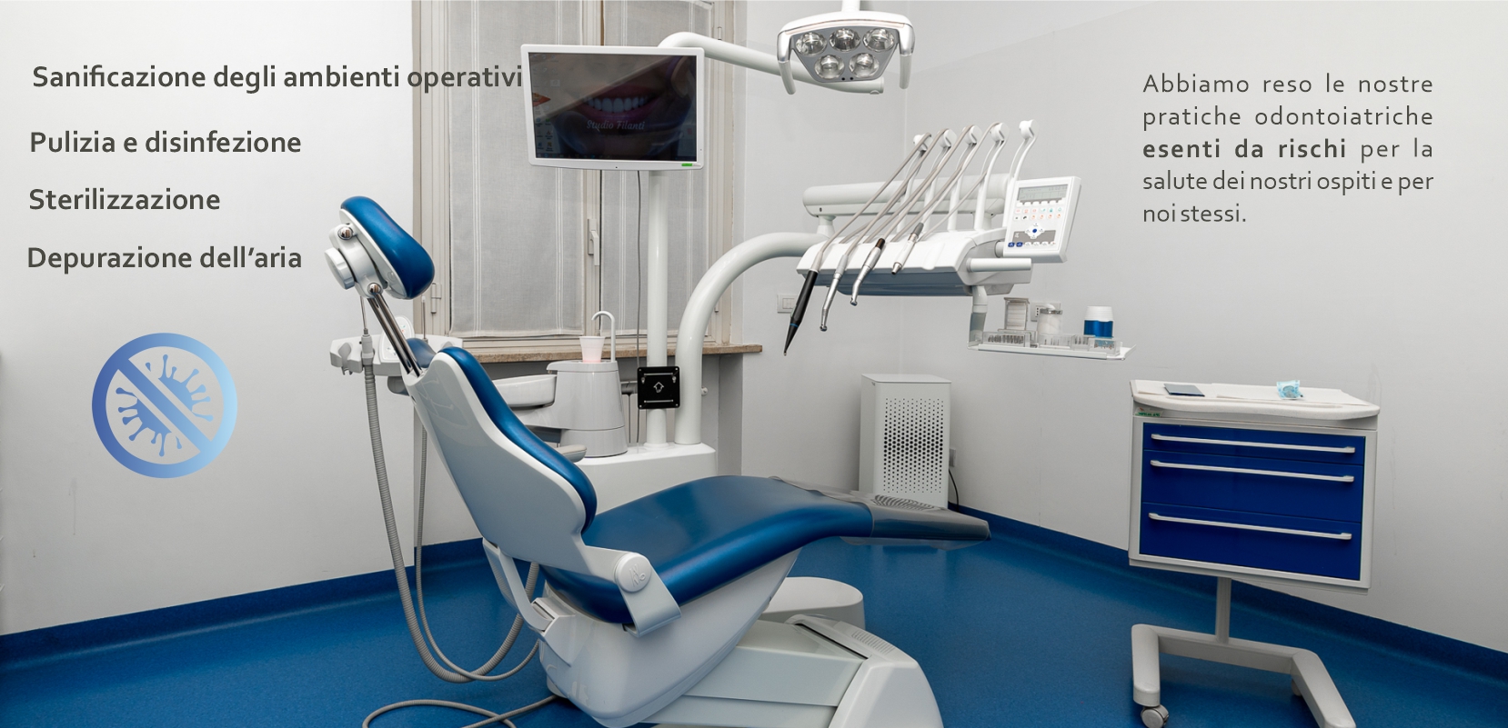 Uno dei punti di forza del nostro studio che ci ha sempre contraddistinto è stata l’attenzione nei dettagli riguardo la pulizia degli ambienti ed i processi di sterilizzazione di ogni singolo strumento, oggi più che mai abbiamo deciso di seguire questa via, elevando ulteriormente ogni operazione inerente l’accoglienza di ogni singolo paziente e la sanificazione degli ambienti operativi in modo da rendere le nostre pratiche odontoiatriche esenti da rischi per la salute dei nostri ospiti e per noi stessi.